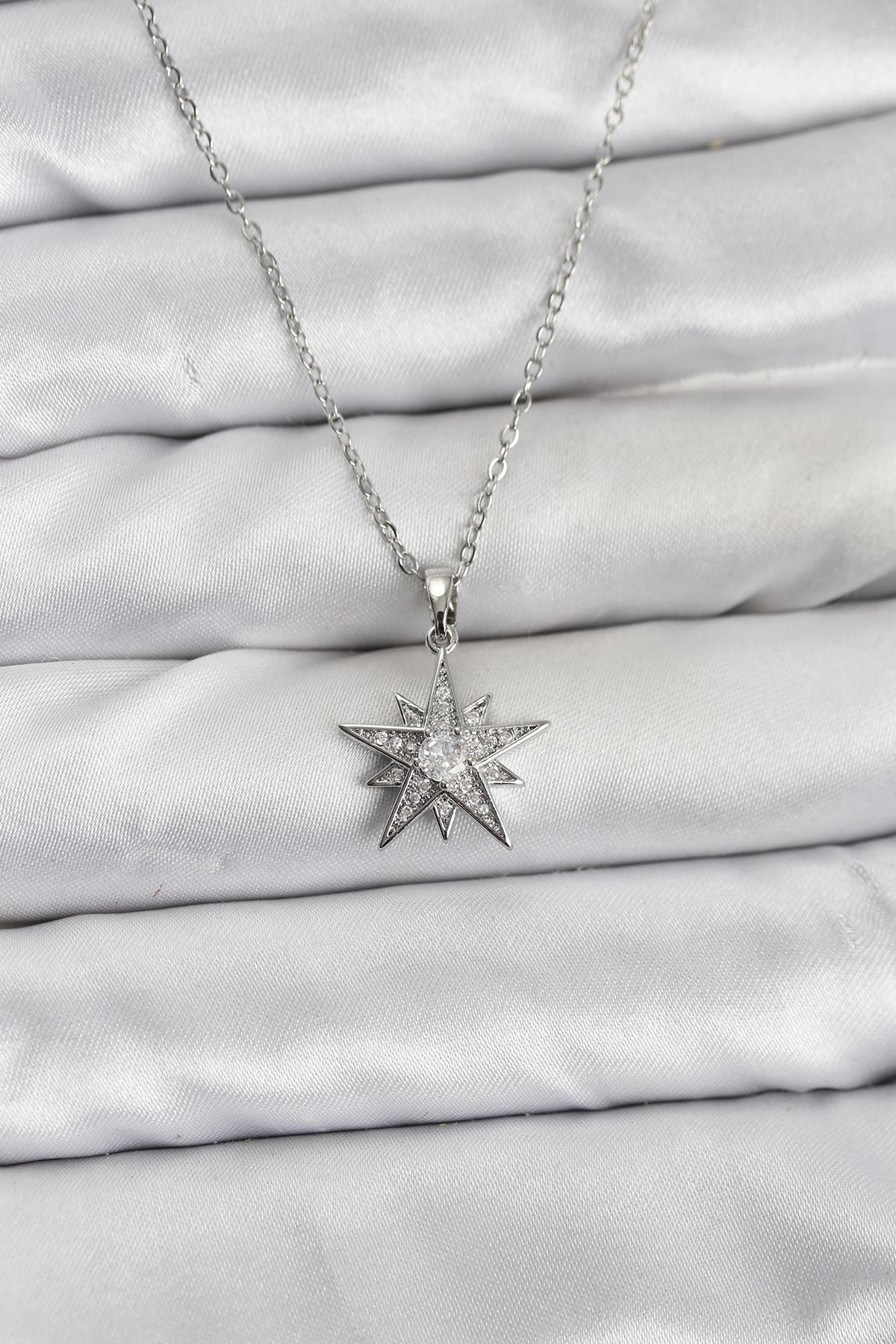 316L Çelik Zincir Gümüş Renk Yıldız Model Zirkon Taşlı Kadın Kolye - TJ-BKO10845