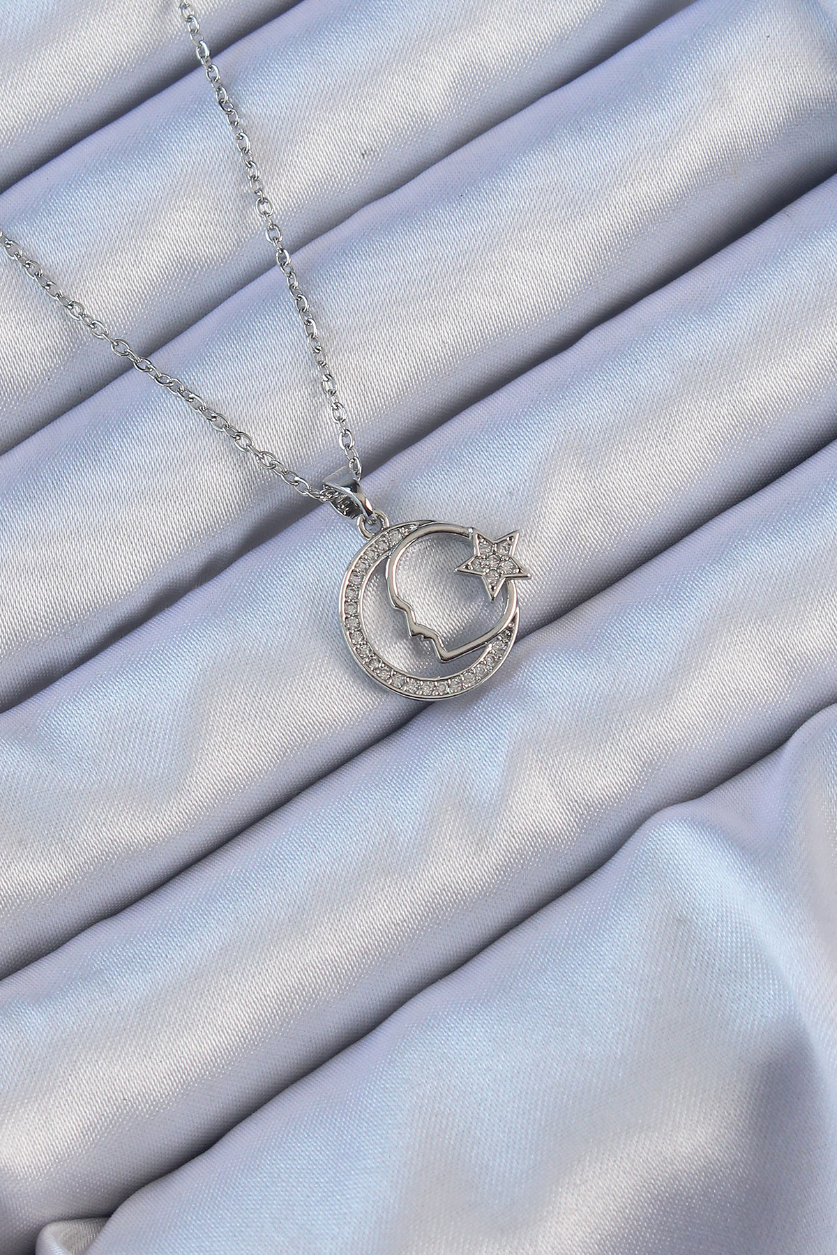 316L Çelik Zincir Gümüş Renk Zirkon Taşlı Ay Yıldız Simgeli Atatürk Kolye - TJ-BKO9118