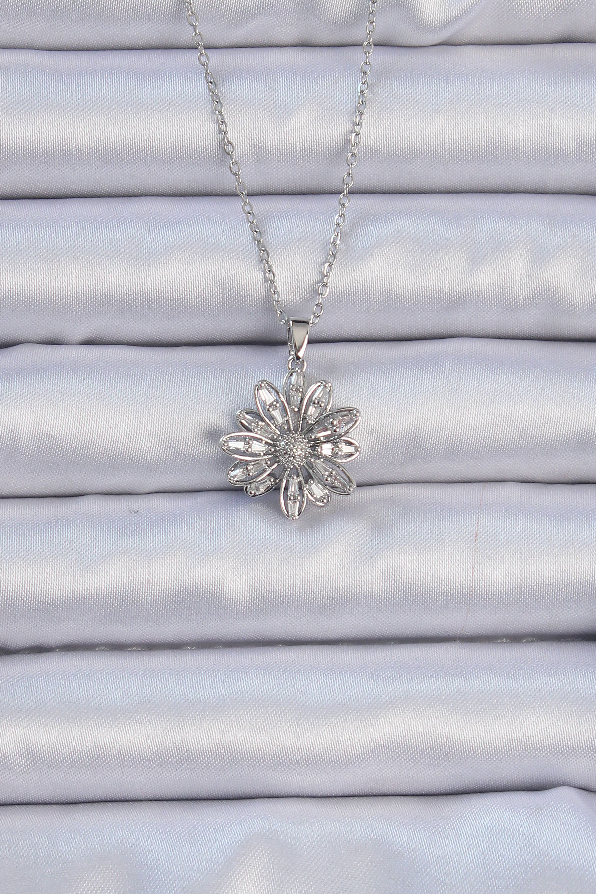 316L Çelik Zincir Gümüş Renk Zirkon Taşlı Çiçek Kolye - TJ-BKO9070