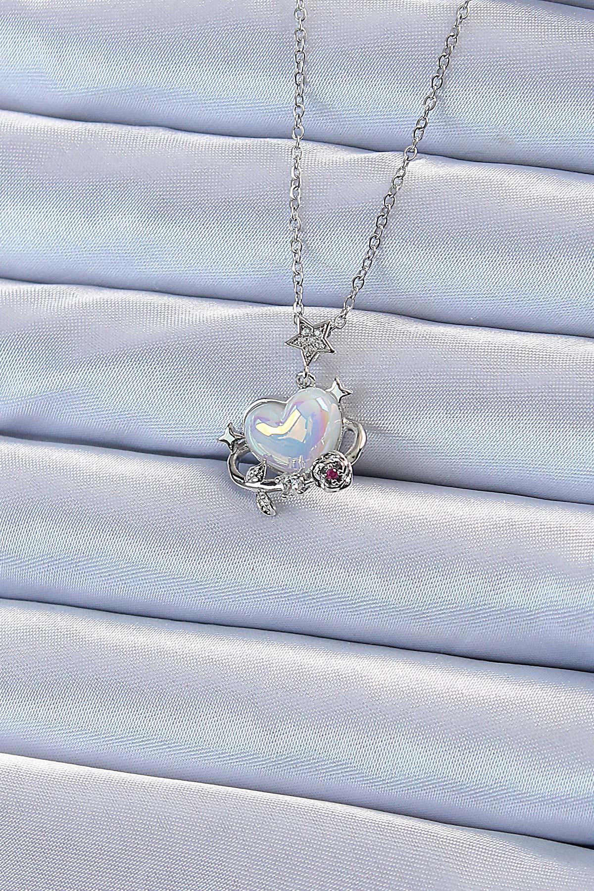 316L Çelik Zincir Gümüş Renk Zirkon Taşlı Gezegen Görünümlü Kalp Kolye - TJ-BKO9218