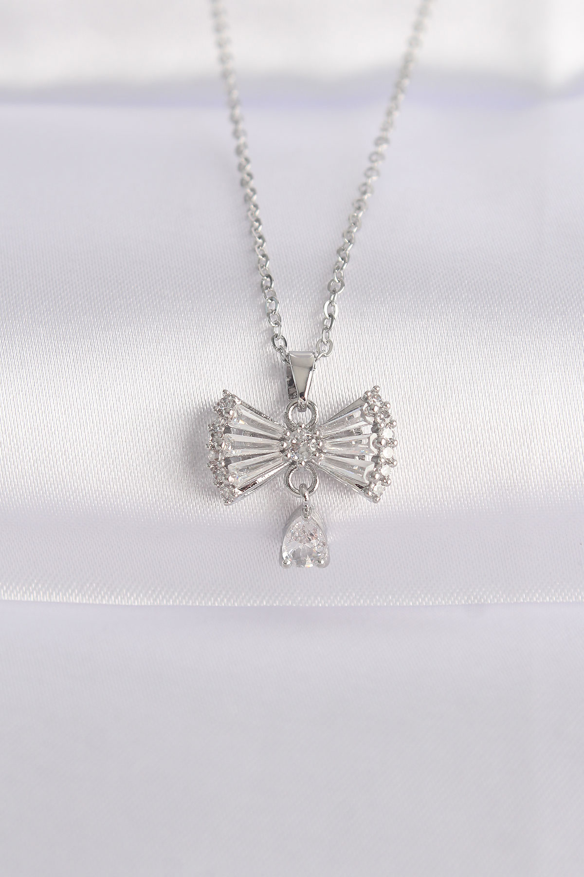 316L Çelik Zincir Gümüş Renk Zirkon Taşlı Kalp Detay Fiyonk Kolye - TJ-BKO8602