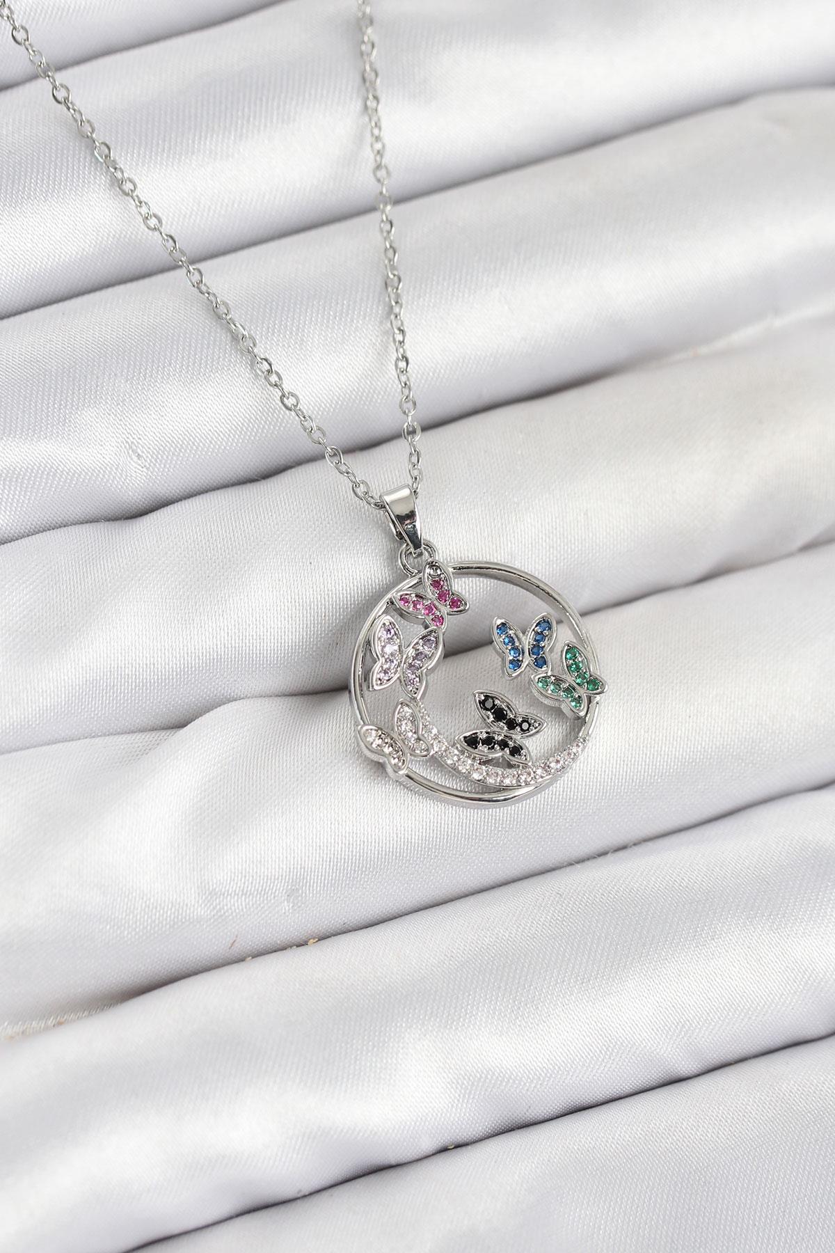 316L Çelik Zincir Gümüş Renk Zirkon Taşlı Kelebekli Kadın Kolye - TJ-BKO10608
