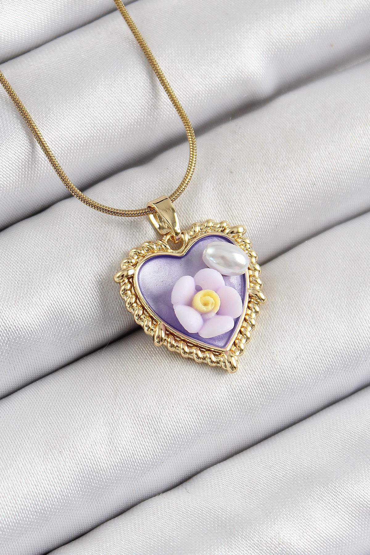 316L Çelik Zincir Mor Sanatsal Portre İnci Detaylı Papatya Figürlü Kalp Model Gold Renk Kadın Kolye - TJ-BKO10272