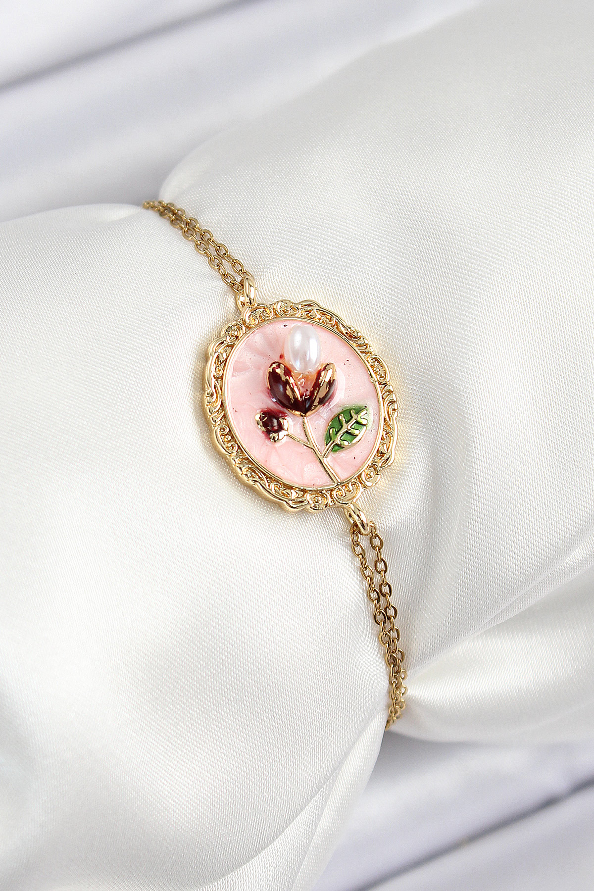 316L Çelik Zincir Pembe Mineli Sanatsal Portre İnci Detaylı Lale Model Gold Renk Kadın Bileklik - TJ-BB7237