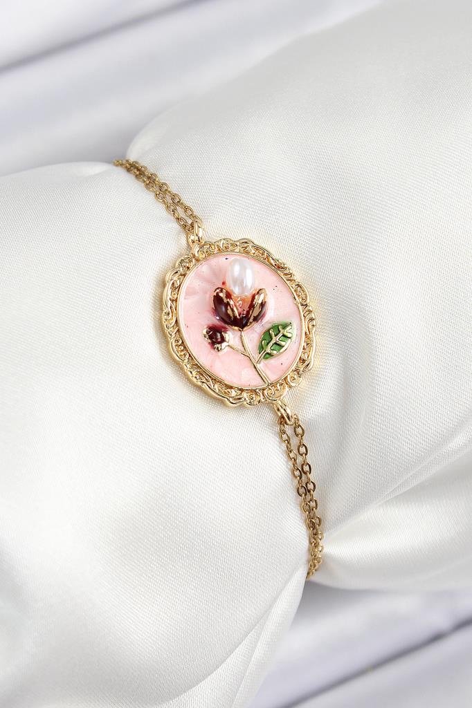 316L Çelik Zincir Pembe Mineli Sanatsal Portre İnci Detaylı Lale Model Gold Renk Kadın Bileklik - BB7237