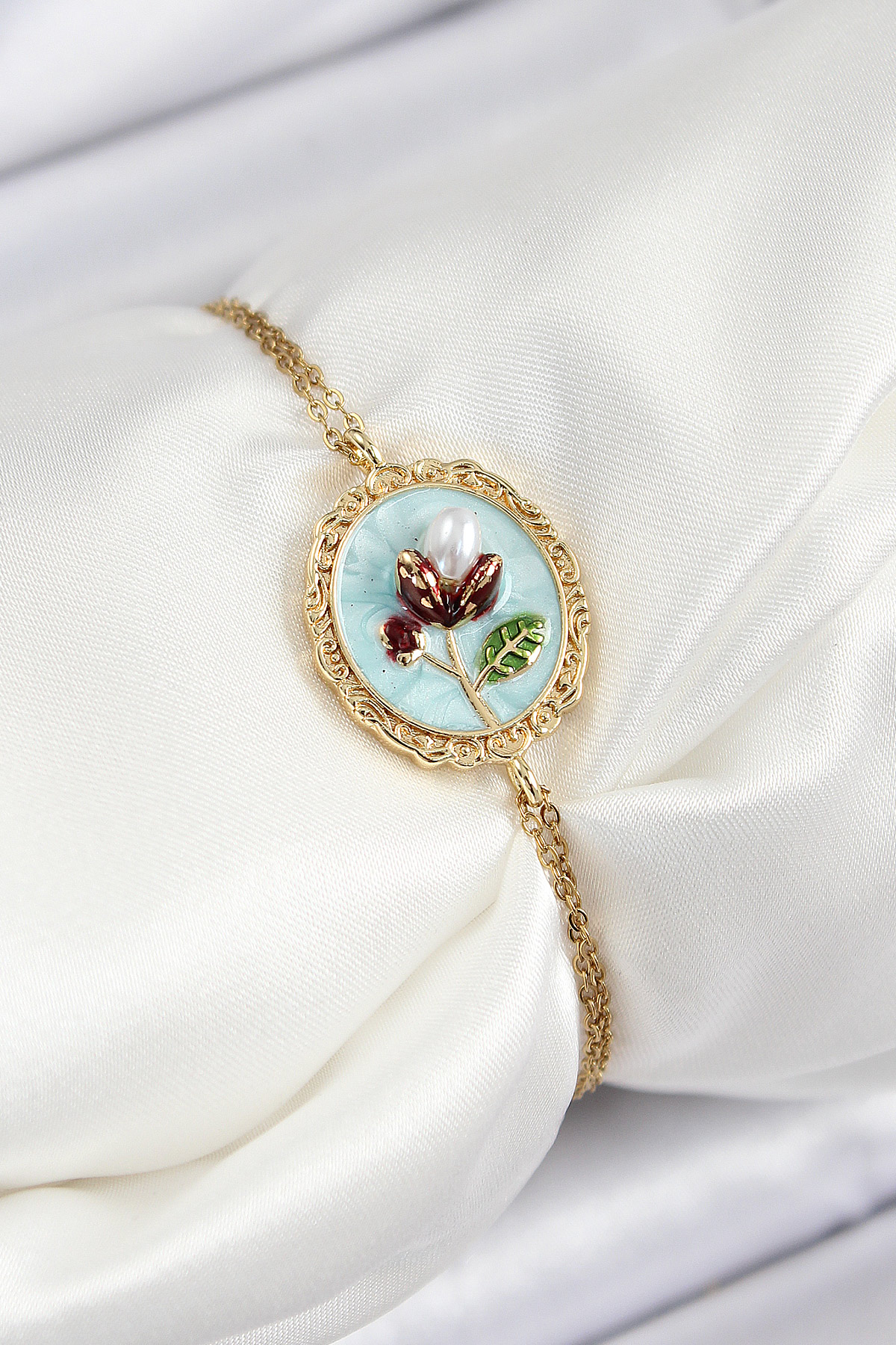316L Çelik Zincir Turkuaz Mineli Sanatsal Portre İnci Detaylı Lale Model Gold Renk Kadın Bileklik - TJ-BB7238