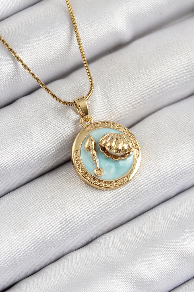 316L Çelik Zincir Turkuaz Mineli Sanatsal Portre İstiridye Model Gold Renk Kadın Kolye - BKO10269