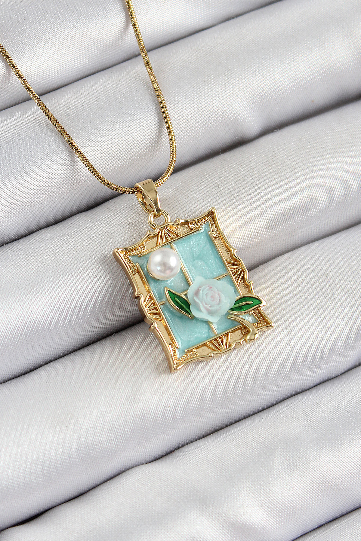 316L Çelik Zincir Turkuaz Sanatsal Portre İnci Detaylı Gül Figürlü Model Gold Renk Kadın Kolye - TJ-BKO10291