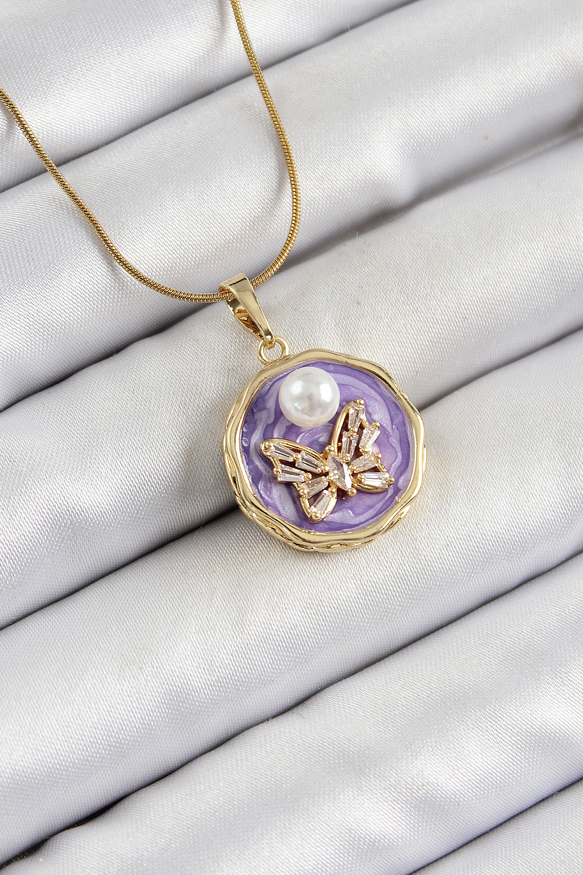 316L Çelik Zincir Zirkon Taşlı Mor Sanatsal Portre İnci Detaylı Kelebek Model Gold Renk Kadın Kolye - TJ-BKO10278