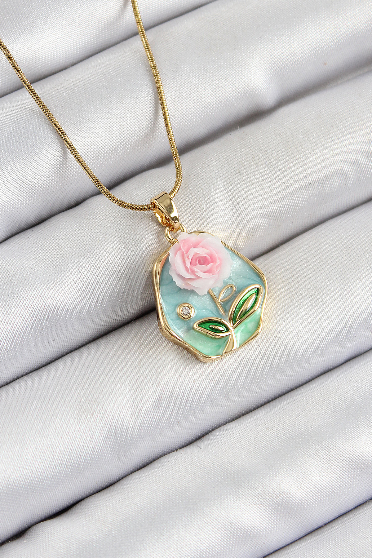 316L Çelik Zincir Zirkon Taşlı Pembe ve Yeşil Sanatsal Portre Gül Figürlü Beşgen Model Gold Renk Kadın Kolye - TJ-BKO10274