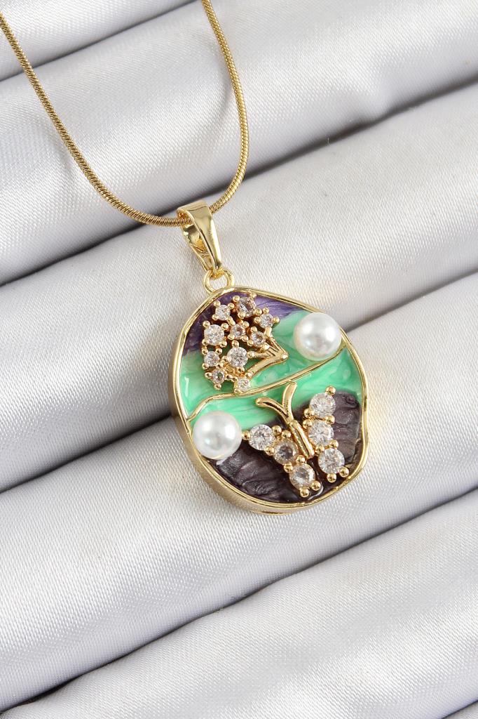 316L Çelik Zincir Zirkon Taşlı Yeşil Mor Sanatsal Portre İnci Detaylı Ağaç Ve Kelebek Figürlü Model Gold Renk Kadın Kolye - TJ-BKO10283