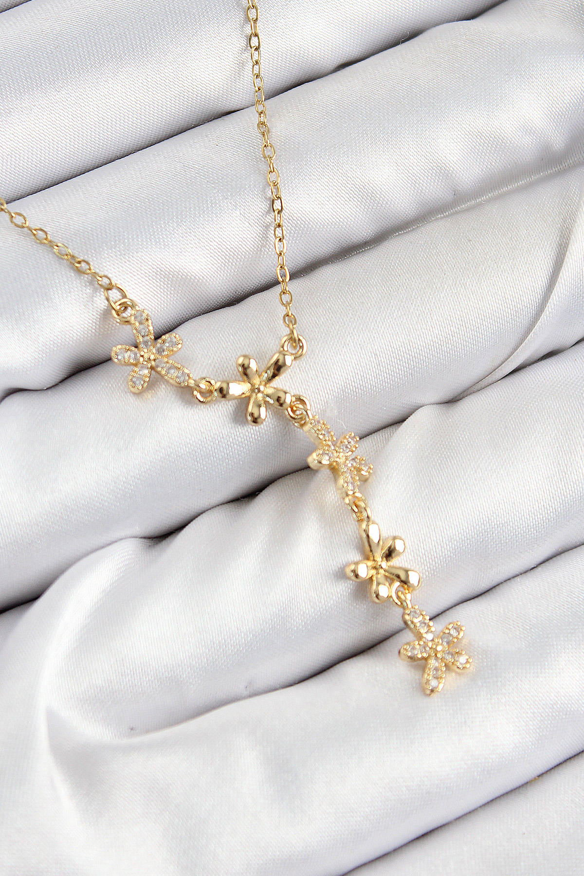 316L Çelik Zirkon Taşlı Çiçek Model Gold Renk Kadın Kolye - TJ-BKO10407