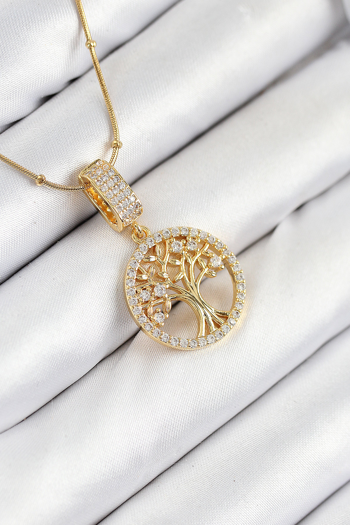 316L Çelik Zirkon Taşlı Hayat Ağacı Model Gold Renk Kadın Kolye - TJ-BKO10525