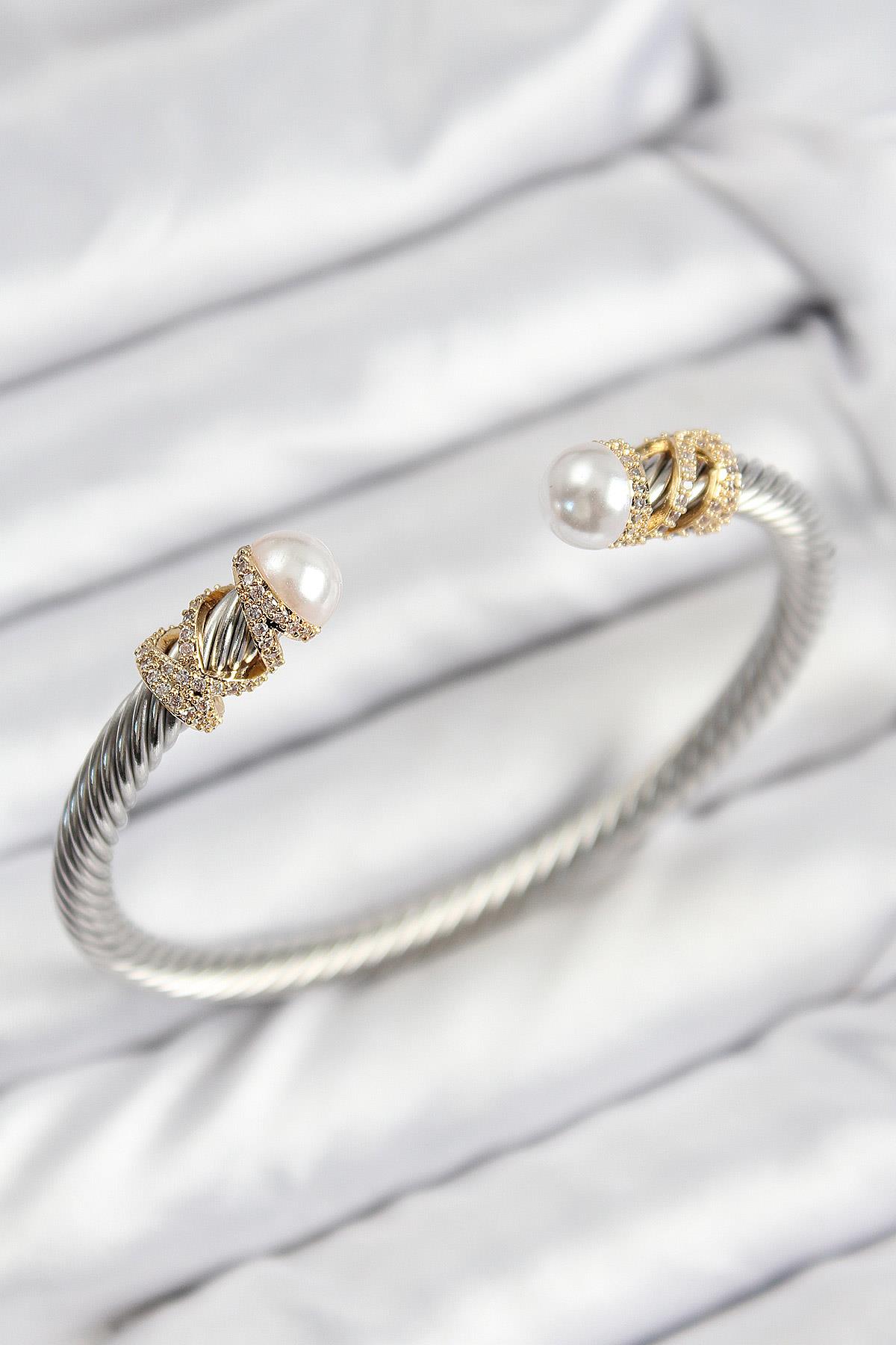 316L Çelik Zirkon Taşlı İnci Model Gold Ve Gümüş Renk Kadın Bileklik - TJ-BB7778