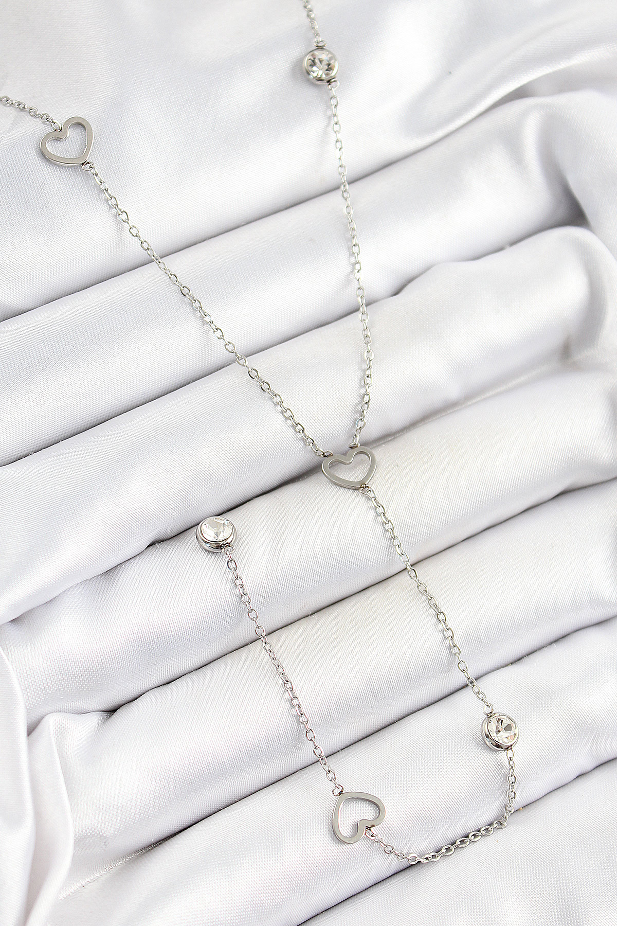 316L Çelik Zirkon Taşlı Kalp Figürlü Y Model Gümüş Renk Kadın Kolye - TJ-BKO10334