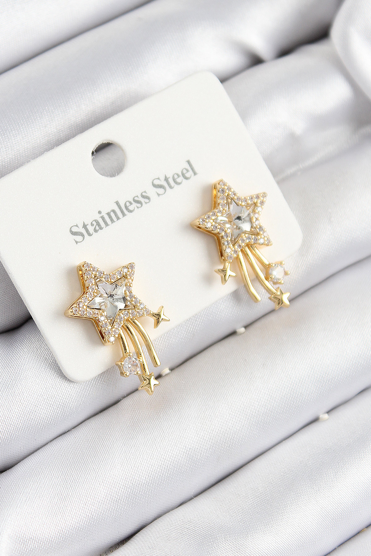 316L Çelik Zirkon Taşlı Kayan Yıldız Model Gold Renk Kadın Küpe - TJ-BKP10931