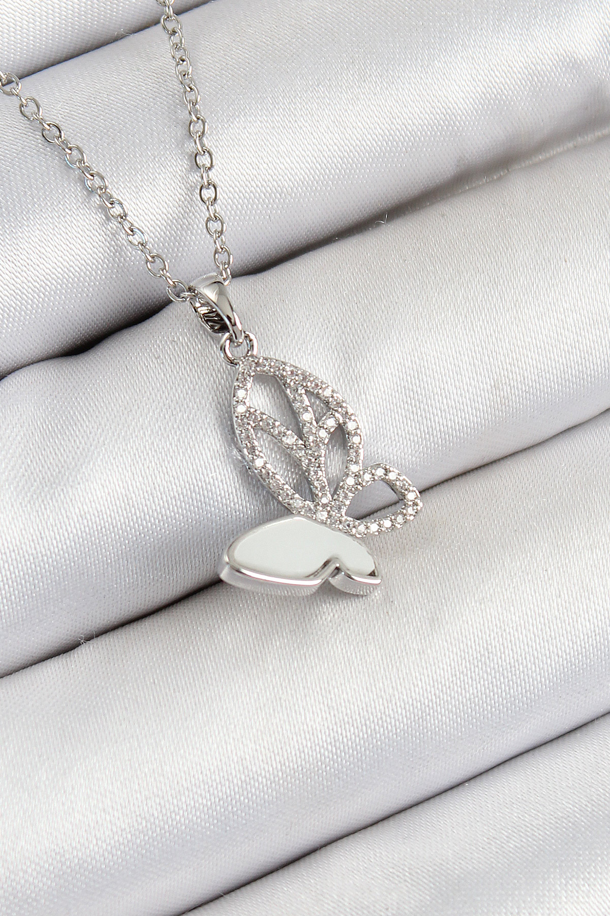 316L Çelik Zirkon Taşlı Kelebek Model Gümüş Renk Kadın Kolye - TJ-BKO10360