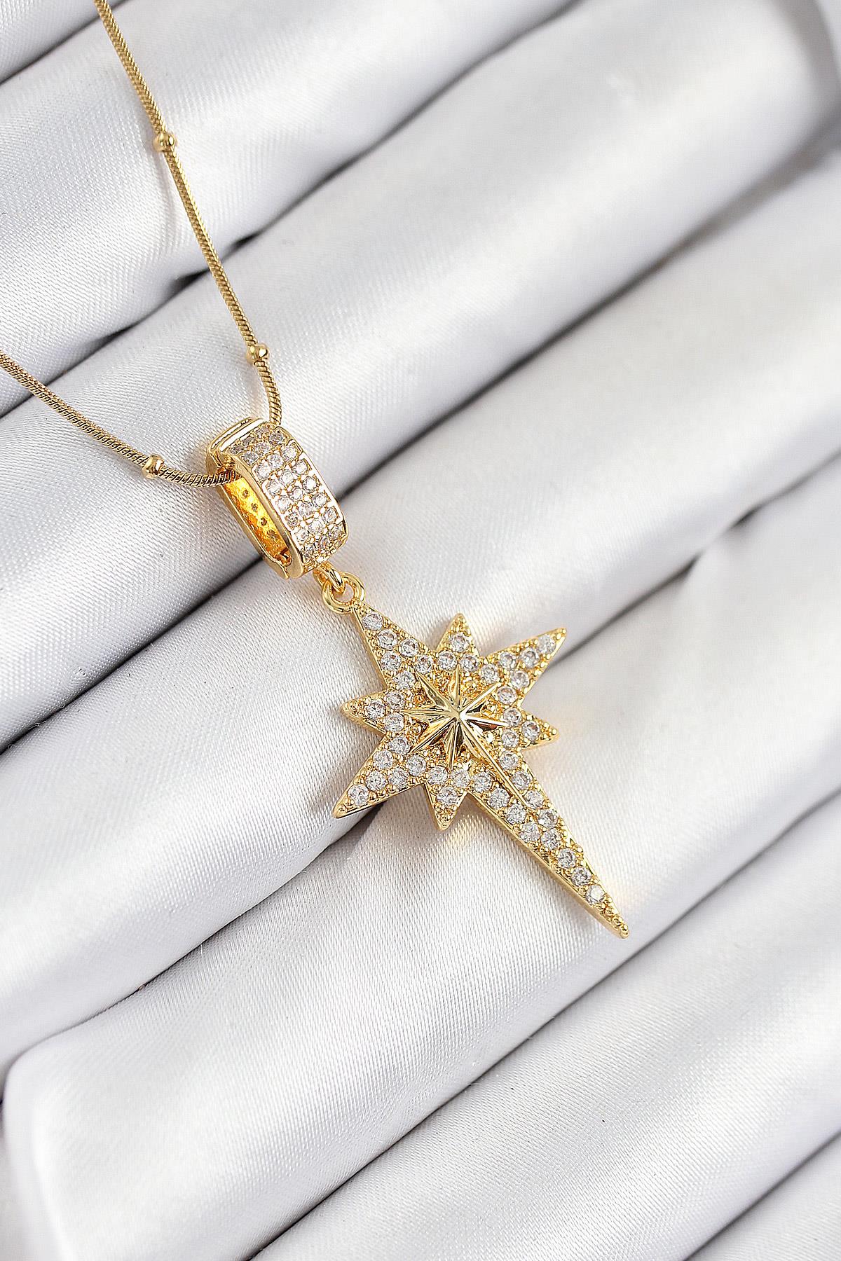 316L Çelik Zirkon Taşlı Kutup Yıldızı Model Gold Renk Kadın Kolye - TJ-BKO10524