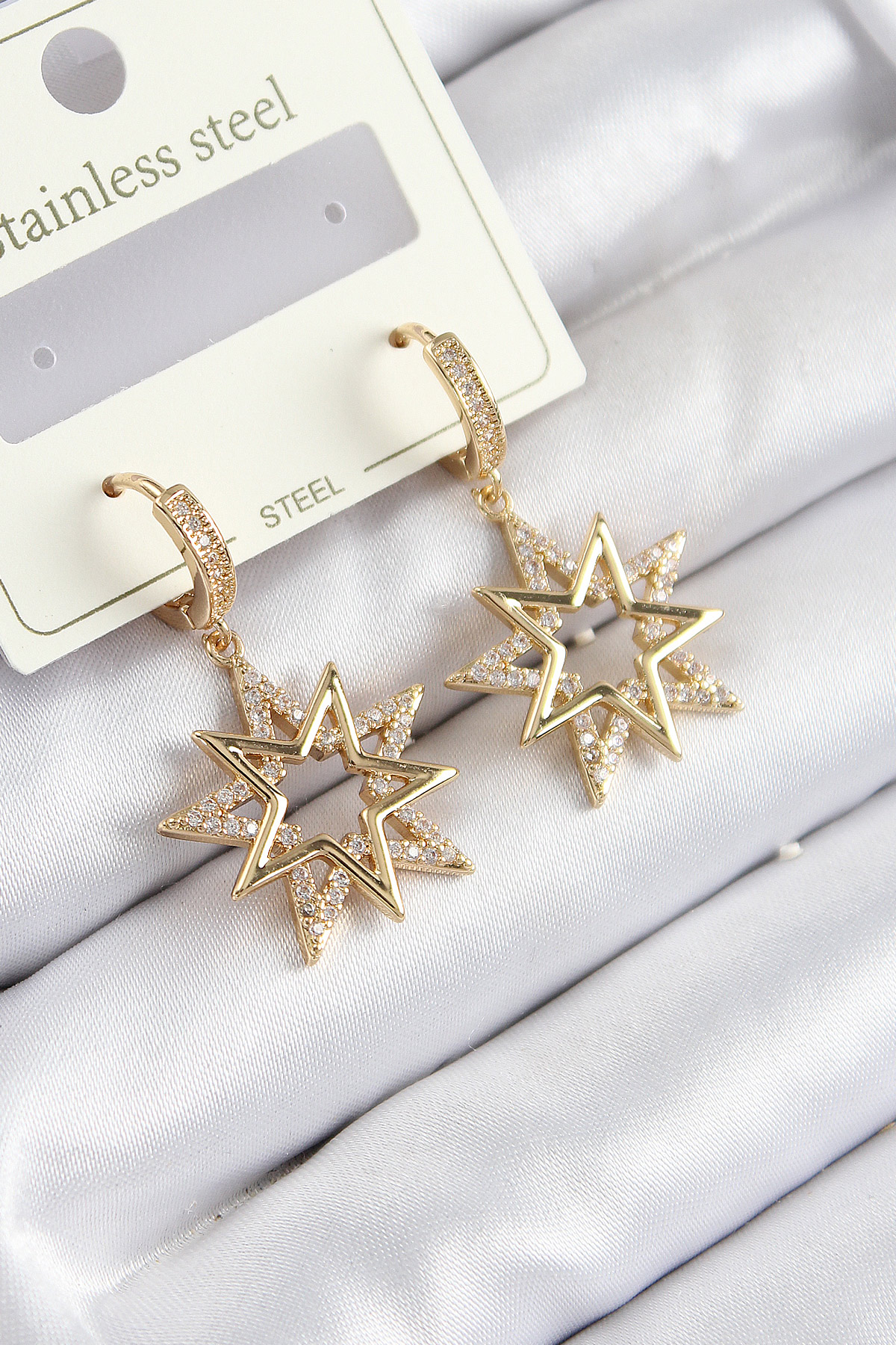 316L Çelik Zirkon Taşlı Sallantılı Yıldız Model Gold Renk Kadın Küpe - TJ-BKP10932