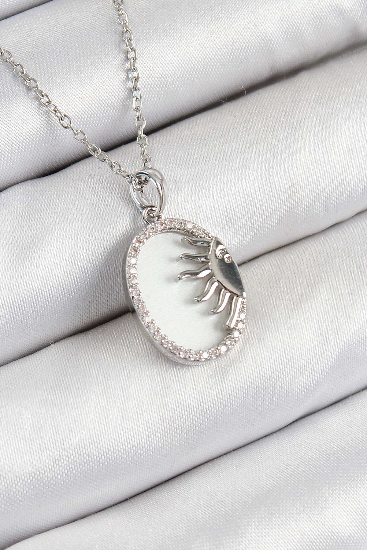 316L Çelik Zirkon Taşlı Yarım Güneş Model Gümüş Renk Kadın Kolye - TJ-BKO10344