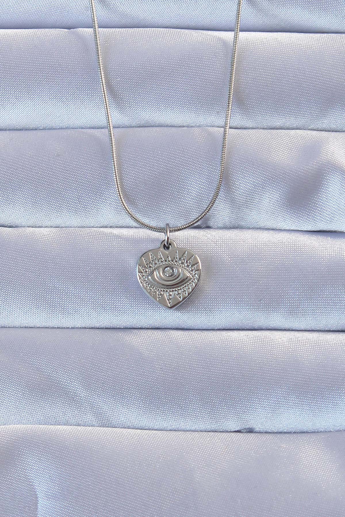 316L Gümüş Renk Zirkon Taşlı İşlemeli Göz Detay Kalp Kolye - TJ-BKO9285
