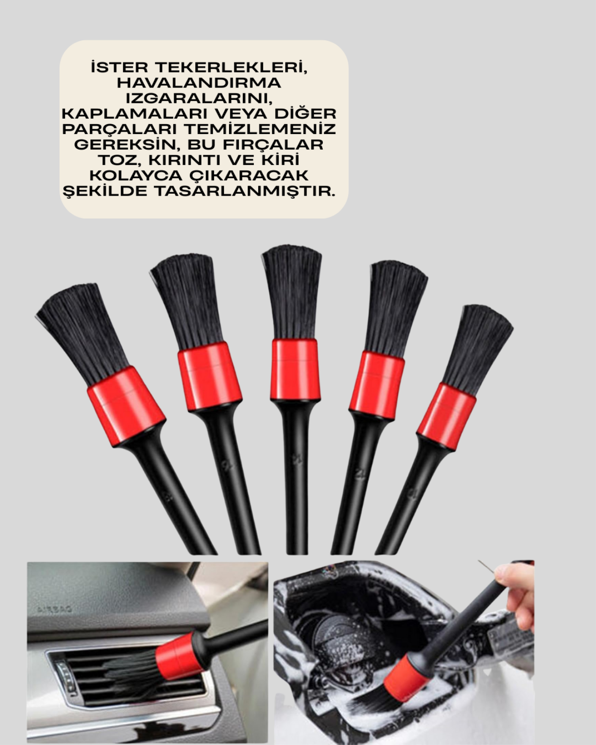 Set içinde bulunan 5 farklı fırça boyutu, koltuk arası, jant, kapı eşiği, havalandırma aralıkları gibi zorlu bölgelerde etkili temizlik sağlar. Fırçaların ergonomik sap tasarımı, uzun süreli kullanımlarda bile konforlu tutuş sunar.