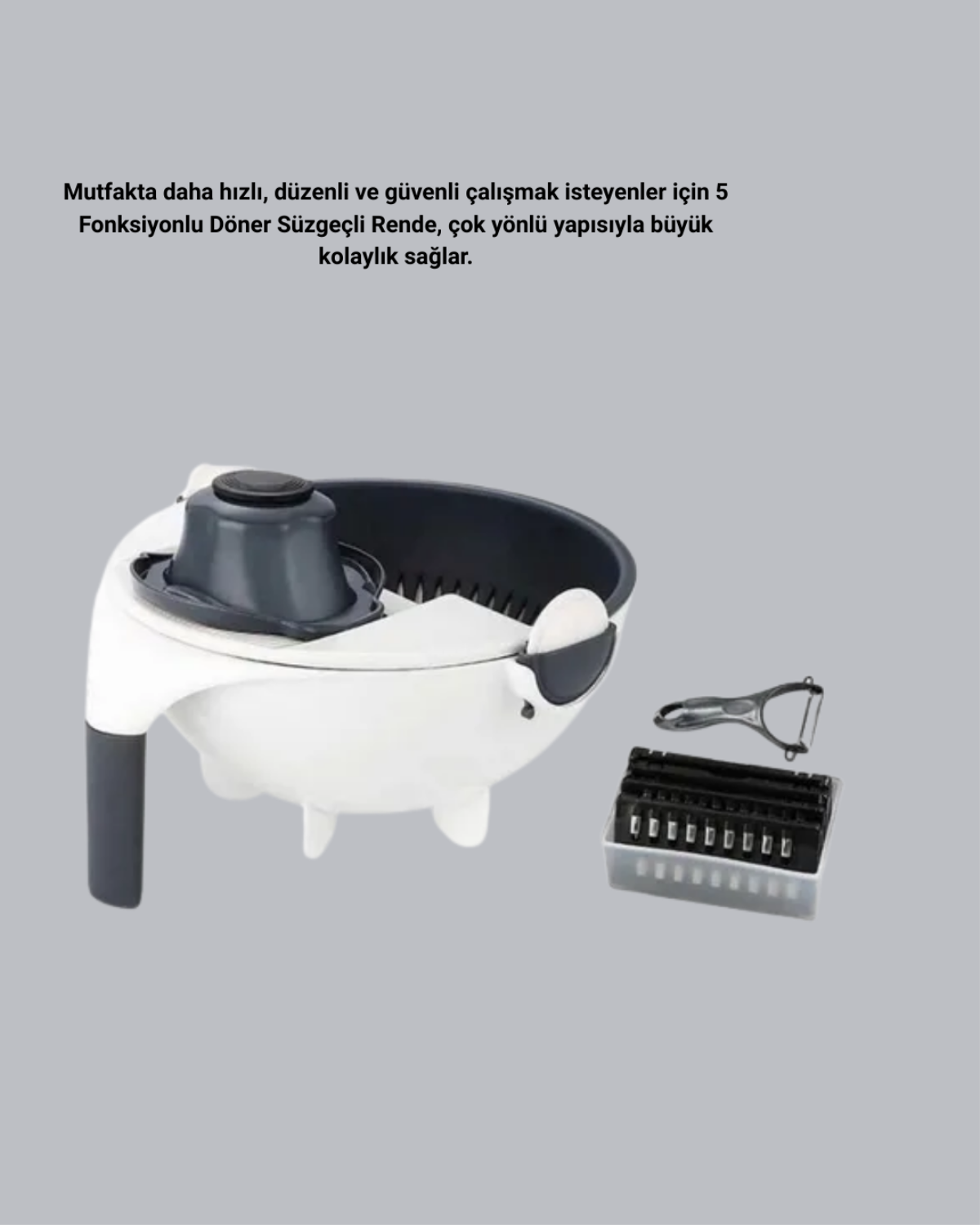 Mutfakta hız, düzen ve güvenlik isteyen kullanıcılar için tasarlanan 5 Fonksiyonlu Döner Süzgeçli Rende, çok yönlülüğü sayesinde yemek hazırlama sürecini daha pratik ve keyifli hale getirir. Ürün, döner mekanizmalı akıllı yapısı ile farklı rende ve doğrama fonksiyonlarını tek cihazda toplar. Böylece sebze ve meyveleri ince rendeleme, kalın rendeleme, şerit kesme, yuvarlak dilimleme veya klasik doğrama şeklinde birkaç saniye içinde hazırlayabilirsiniz.