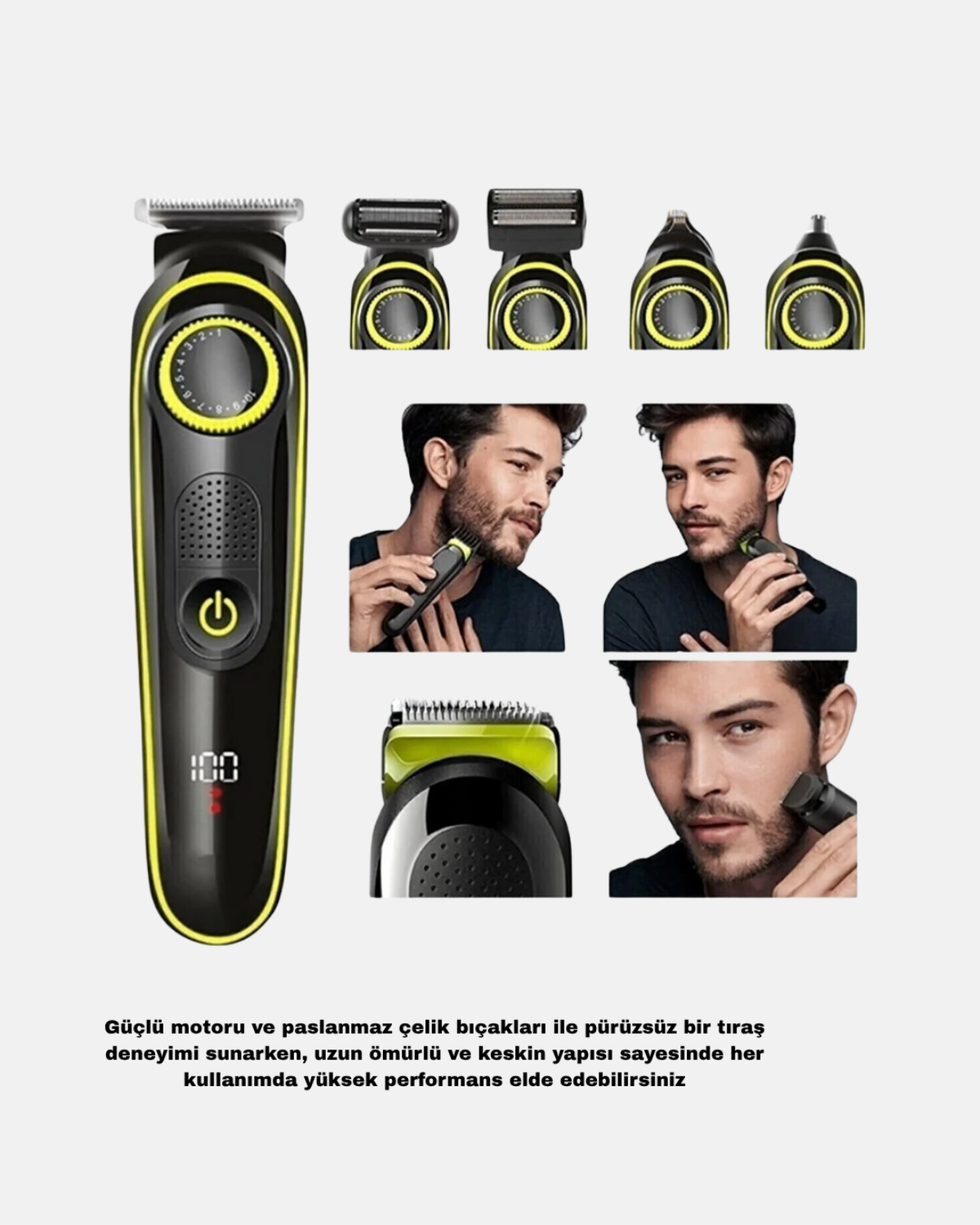 5’i 1 Arada Erkek Bakım Seti, saç kesimi, sakal tıraşı, burun ve kulak kılı temizliği, detaylı şekillendirme ve vücut tıraşı gibi tüm işlemleri tek cihazda bir araya getirir.