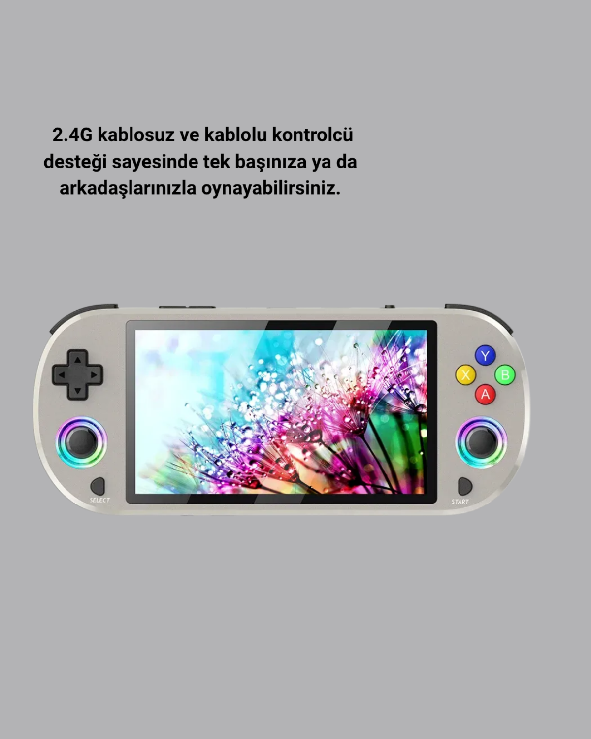 RGB aydınlatmalı joystick halkası 16 milyon farklı renkle kişiselleştirilebilir, bu da cihazı hem estetik hem de eğlenceli kılar. HD çıkış desteği ile televizyona bağlayabilir, Wi-Fi üzerinden çevrim içi bağlantılar kurabilir veya 2.4G kablosuz kontrolcülerle çoklu oyun keyfi yaşayabilirsiniz.