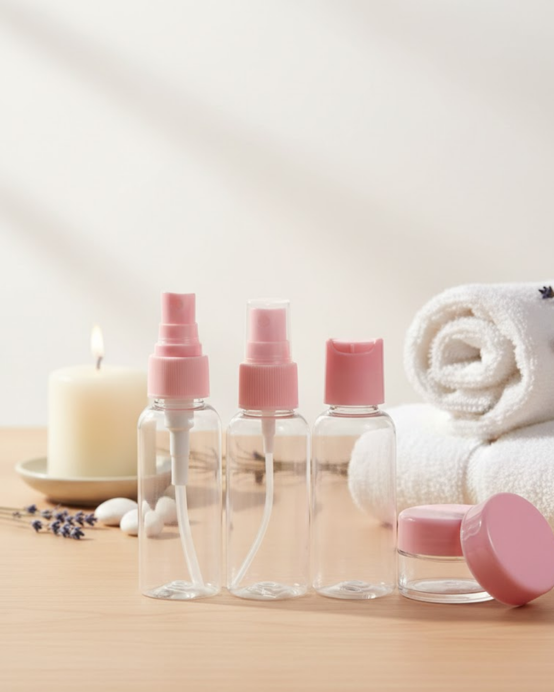 5 Parça Seyahat Boy Kozmetik Seti, minimal tasarımı ve fonksiyonel yapısı ile kişisel bakım rutininizi seyahatlerde de kesintisiz sürdürmenizi sağlar. Set içeriğinde bir adet 30 ml sıvı şişe, bir adet sprey şişe, bir adet şampuan kabı ve iki adet krem muhafaza kabı yer alır.