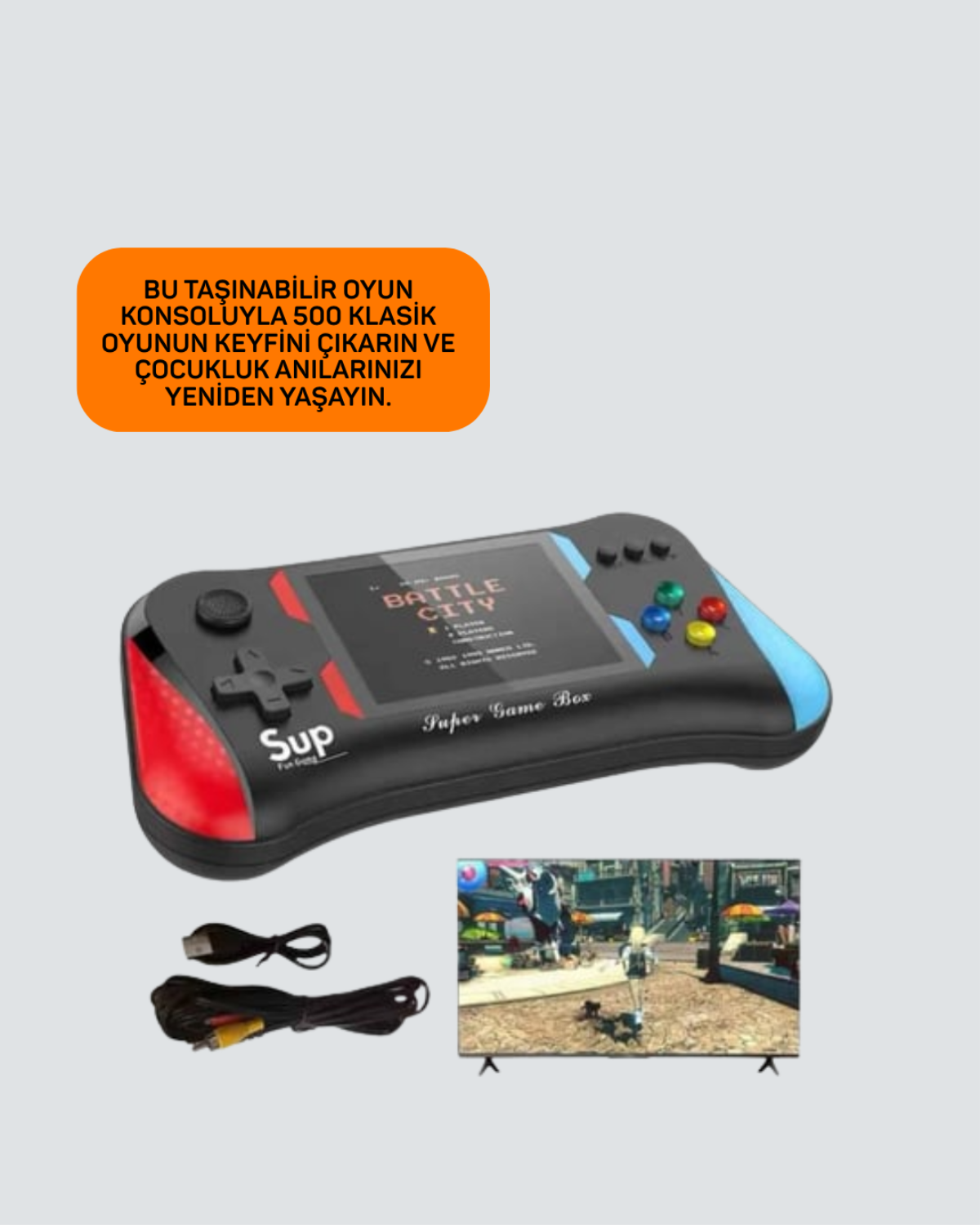 Bu taşınabilir oyun konsolu ile 500 klasik oyun bir arada! Çocukluk anılarınızı yeniden yaşayın ve eğlenceli vakit geçirin. 3,5 inçlik geniş LCD ekranı sayesinde oyunlar daha net ve renkli görünüyor, uzun oyun saatlerinde gözleriniz yorulmuyor. Üstelik AV çıkışıyla TV’nize bağlayarak büyük ekranda da oynayabilirsiniz.