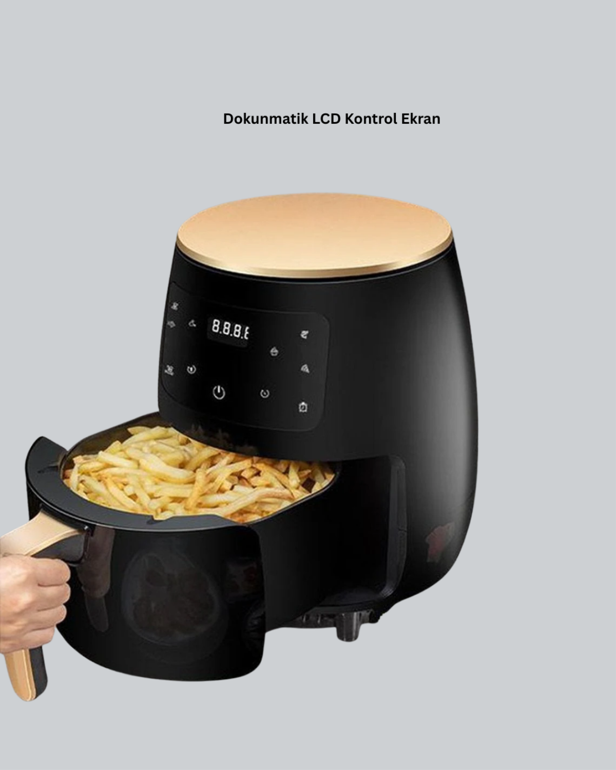 Bu 6 litrelik Airfryer, hem pratik hem de sağlıklı bir pişirme deneyimi sunmak için tasarlanmış yeni nesil mutfak teknolojilerinden biridir. 2400W yüksek güç kapasitesi, yiyeceklerin hızlı ve eşit şekilde pişmesini sağlayarak özellikle kalabalık aileler ve yoğun yaşam temposuna sahip kullanıcılar için büyük kolaylık sunar. Dokunmatik LCD ekran sayesinde cihazın tüm ayarları sezgisel şekilde kontrol edilebilir, zamanlayıcı ve sıcaklık ayarları tek dokunuşla yapılabilir.