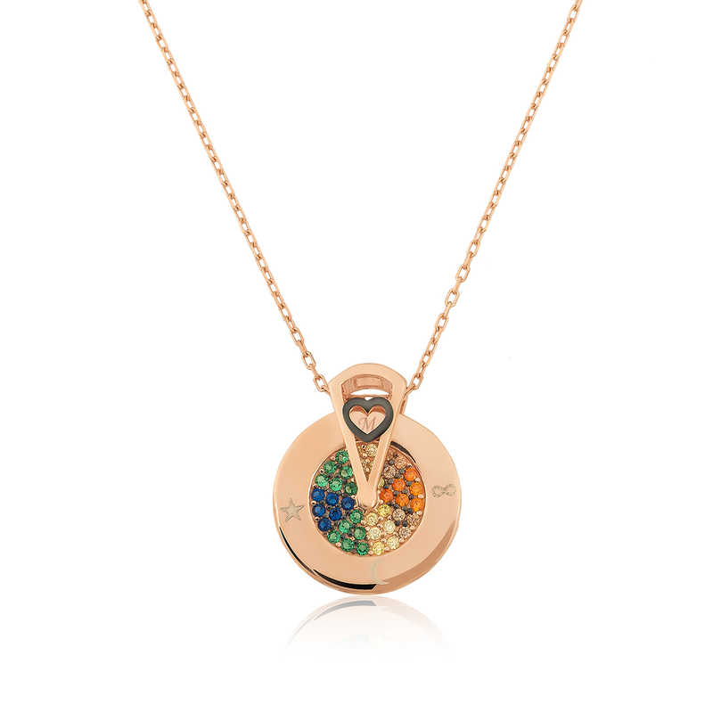 Ay, yıldız ve sonsuzluk sembollerinin yer aldığı çark kolyeye hayatınızdaki özel kişinin isminin baş harfini yazdırarak ona alışılmışın dışında bir hediye vermeye ne dersiniz? Gecenizi aydınlatan ay, sonsuz aşk ve hayatınızdaki şansı temsil eden yıldız sembollerinin yer aldığı bu şık tasarım kolye; doğum günü hediyesi, sevgililer günü hediyesi veya annelere hediye olarak özel günlerde tercih edilebilecek mükemmel bir seçenektir. Bu şık kolye; 925 ayar gümüşten imal edilmiştir. Gümüş Aşk çarkı kolye üzerine rose kaplama yapılmıştır. Rose kaplama yapılan tüm kolye modelleri parlaklığını uzun süre muhafaza eder, gümüşü pembe renge dönüştürür ve oksitlenmesini geciktirir. Zincir boyu ortalama 45 cm'dir. Tüm gümüş kolye modellerinde olduğu gibi bu gümüş aşk çarkı kolye de el emeği ile üretilmiştir. Gümüş ve değerli taşlar nedeniyle ürün ağırlığında ± %10 sapma olabilmektedir.