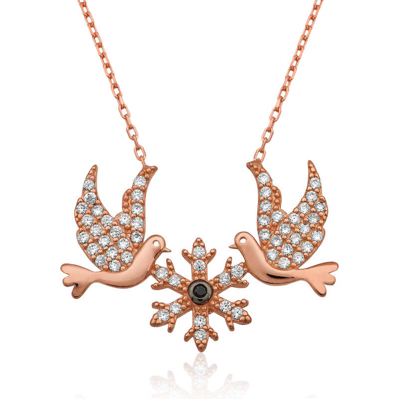Kadınların boyunlarını ortaya çıkaran ve kıyafetlerini çok daha belirgin hale getiren kolyeler, aksesuarlar arasında vazgeçilmezler arasındadır. Gümüş aşk kuşları kolye yeni yıl, 14 Şubat sevgililer günü ve doğum günü gibi özel günlerde tercih edilebilecek en anlamlı hediye seçeneklerinden biridir. Kaliteli ve şık gümüş kolyeleri satın almak hayal olmaktan çıktı. 925 ayardan üretilen bu şık gümüş kolye üzerine rose altın kaplama yapılmıştır. Rose altın kaplama yapılan gümüş kolyeler parlaklığını uzun süre muhafaza eder ve oksitlenmesi gecikir, gümüşe bakır rengini verir. Tüm kolyelerde olduğu gibi gümüş aşk kuşları kolye modeli de el emeği ile üretilmiştir. Gümüş ve değerli taşlar nedeniyle belirtilen ortalama ürün ağırlığında ± %10 sapma olabilmektedir.