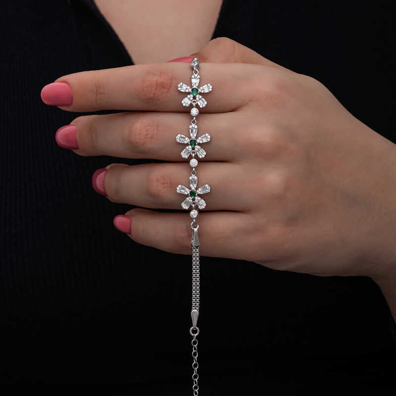 Gümüş Baget Çiçek Desenli Kadın Bileklik
