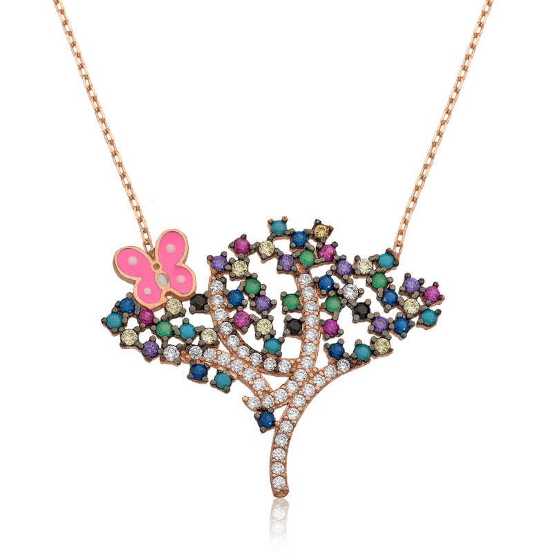 Rengarenk kır çiçeklerini simgeleyen zirkon taşlarla hazırlanmış, dalına kelebek konmuş bahar ağacı kolye sevdiklerinizi gülümsetmek, her gördüklerinde sizi hatırlamalarını sağlamak için güzel bir tercih olacaktır. Bahar ağacı kolye 925 ayar gümüşten imal edilmiştir. Gümüş üzerine rose altın kaplama yapılmıştır. Rose ald-tın kaplama gümüşse pembe rengi verir. Rose altın kaplama yapılan gümüş kolye modelleri parlaklığını uzun süre muhafaza eder. Tüm kolye modellerinde olduğu gibi gümüş bahar ağacı kolye modeli de el emeği ile üretilmiştir. Gümüş ve değerli taşlar nedeniyle belirtilen ortalama ürün ağırlığında ± %10 sapma olabilmektedir.