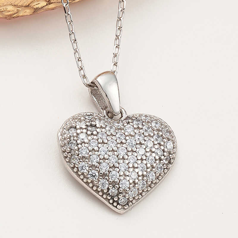 Kalp simgesi daima koşulsuz sevginin ve aşkın sembolü olmuştur. Dini öğretilerde ise kalbin gücü sınırsızdır. Çünkü kalp Yaradanın evi, bizim ise evrene açılan gerçeklik kapımızdır. Bu şık gümüş bombeli kalp kolye; doğum günü hediyesi, sevgililer günü hediyesi veya annelere hediye olarak özel günlerde tercih edilebilecek mükemmel bir seçenektir. Gümüş bombeli kalp kadın kolye 925 ayar gümüşten imal edilmiştir. Bu kolye üzerinde rodyum kaplama yapılmıştır. Rodyum kaplama yapılan gümüş kadın kolye modelleri parlaklığını uzun süre muhafaza eder. Üzerinde bulunan taşlar zirkondur. Tüm gümüş kadın kolye modellerimizde olduğu gibi gümüş bombeli kalp kadın kolye modeli de el emeği ile üretilmiştir. Gümüş ve değerli taşlar nedeniyle belirtilen ortalama ürün ağırlığında ± %10 sapma olabilmektedir.