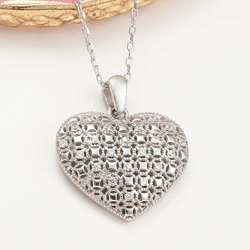 Kalp simgesi daima koşulsuz sevginin ve aşkın sembolü olmuştur. Dini öğretilerde ise kalbin gücü sınırsızdır. Çünkü kalp Yaradanın evi, bizim ise evrene açılan gerçeklik kapımızdır. Bu şık gümüş bombeli kalp kolye; doğum günü hediyesi, sevgililer günü hediyesi veya annelere hediye olarak özel günlerde tercih edilebilecek mükemmel bir seçenektir. Gümüş bombeli kalp kadın kolye 925 ayar gümüşten imal edilmiştir. Bu kolye üzerinde rodyum kaplama yapılmıştır. Rodyum kaplama yapılan gümüş kadın kolye modelleri parlaklığını uzun süre muhafaza eder. Üzerinde bulunan taşlar zirkondur. Tüm gümüş kadın kolye modellerimizde olduğu gibi gümüş bombeli kalp kadın kolye modeli de el emeği ile üretilmiştir. Gümüş ve değerli taşlar nedeniyle belirtilen ortalama ürün ağırlığında ± %10 sapma olabilmektedir.