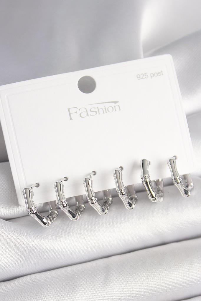 925 Ayar Gümüş Çivi Pirinç Gümüş Renk Bambu Halka Model Kadın Küpe Seti - BKP10408