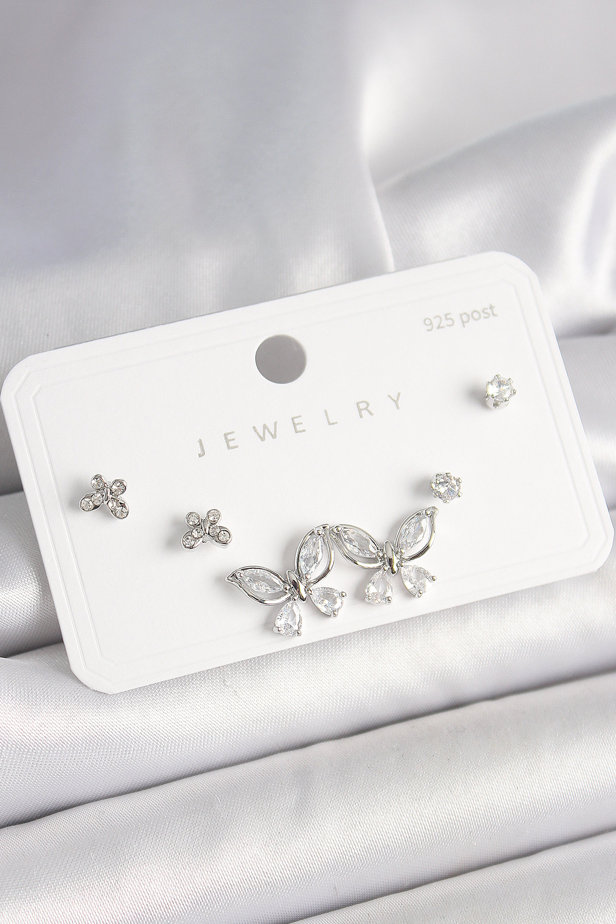 925 Ayar Gümüş Çivi Pirinç Gümüş Renk Zirkon Taşlı Kelebek Model Kadın Küpe Seti - TJ-BKP10394