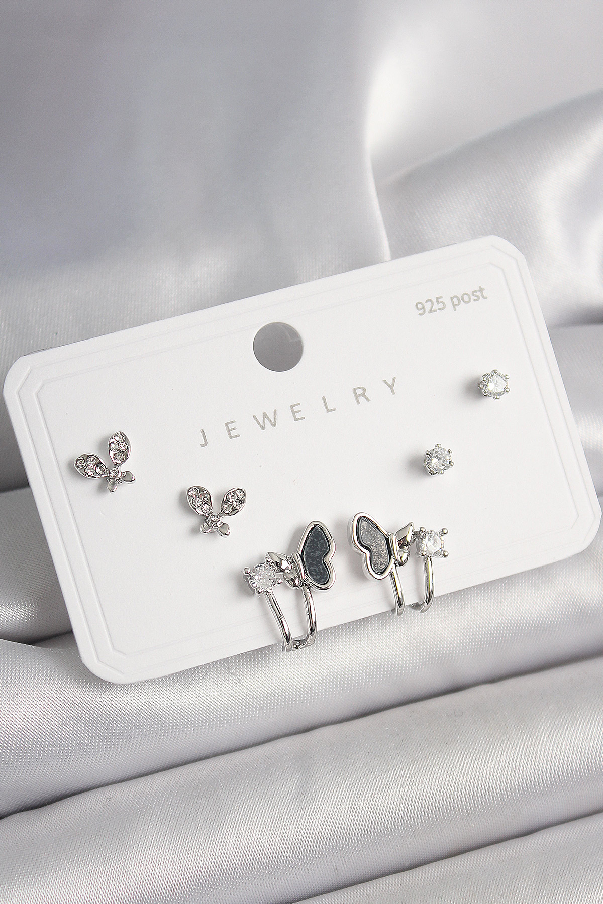 925 Ayar Gümüş Çivi Pirinç Gümüş Renk Zirkon Taşlı Kelebek Model Kadın Küpe Seti - TJ-BKP10404