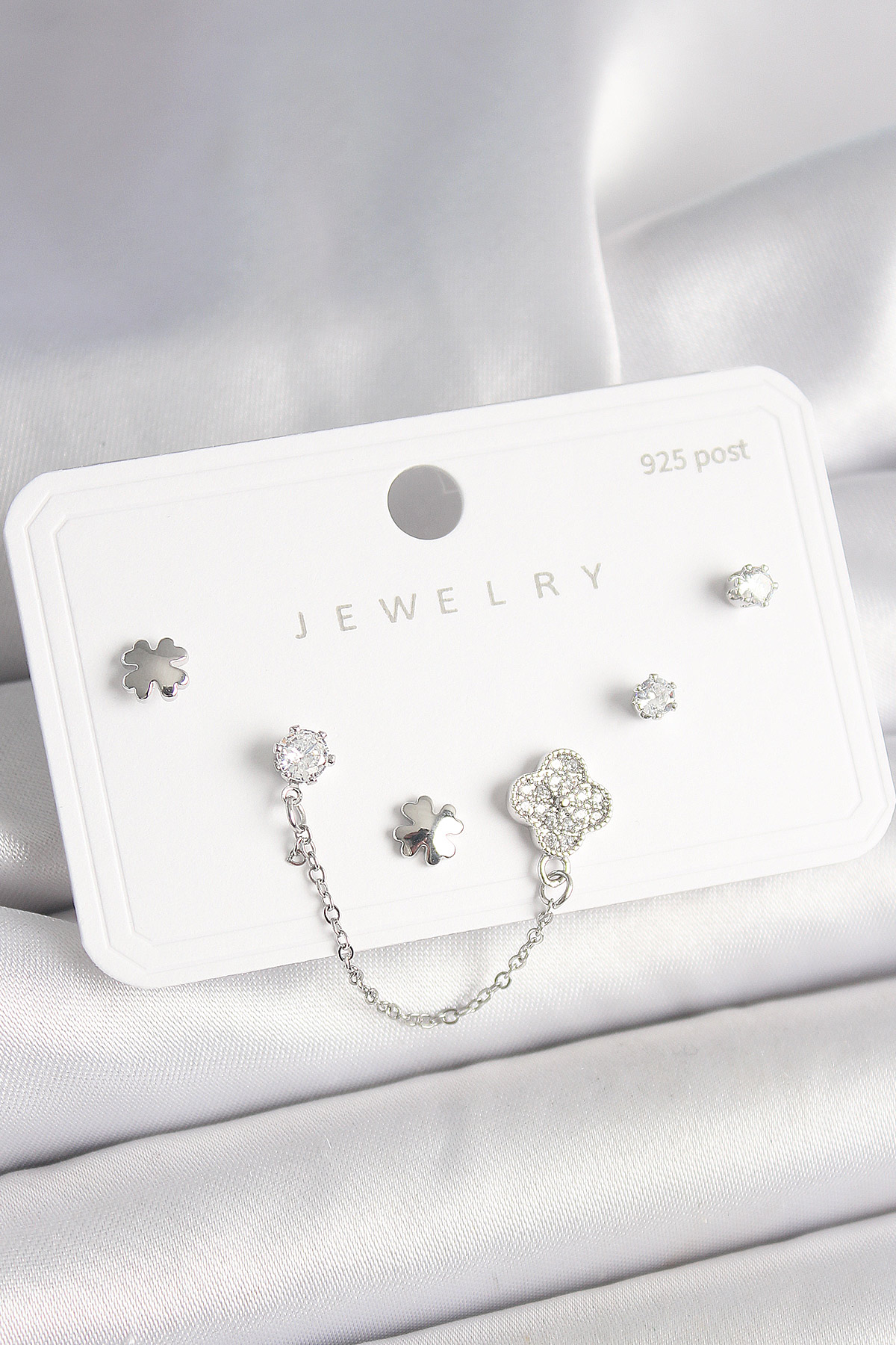 925 Ayar Gümüş Çivi Pirinç Gümüş Renk Zirkon Taşlı Yonca Model Sallantı Zincir Detay Kadın Küpe Seti - TJ-BKP10400
