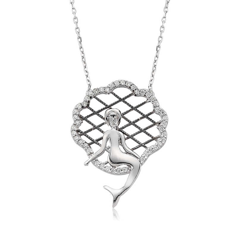 Günlük hayatınızda rahatlıkla kullanabileceğiniz bir model, sade tasarımıyla sevdiklerinize hediye edebileceğiniz kolyelerden biri olabilecek bu gümüş deniz kızı bayan kolye modeli 925 ayar gümüşten imal edilmiştir. Gümüş üzerine rodyum kaplama yapılmıştır. Rodyum kaplama yapılan gümüş bayan kolye modelleri parlaklığını uzun süre muhafaza eder ve oksitlenmesi gecikir. Kolye üzerinde bulunan beyaz taşlar zirkondur. Gümüş olan zincirin boyu ortalama 45cm'dir. Tüm gümüş bayan kolye modellerinde olduğu gibi bu deniz kızı bayan kolye modeli de el emeği ile üretilmiştir. Gümüş ve değerli taşlar nedeniyle belirtilen ortalama ürün ağırlığında ± %10 sapma olabilmektedir.