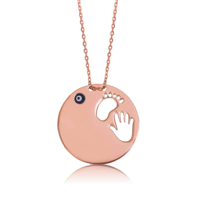 Masumiyeti ve saflığı simgeleyen el ve ayak izi kolye hayatta en değerli varlığınız olan anneniz için en anlamlı hediyelerden biri olacaktır. El ayak izi anne kolye 925 ayar gümüşten imal edilmiştir. Gümüş üzerine rose kaplama yapılmıştır. Rose kaplama yapılan gümüş kolye modelleri parlaklığını uzun süre muhafaza eder. İstenildiği takdirde kolye üzerinde isim ve tarih yazılabilir. Kolye üzerindeki nazar boncuğu soğuk mine yöntemiyle yapılmıştır. Gümüş olan zincir boyu ortalama 45 cm'dir. Gümüş el ayak izi anne kolye modeli diğer tüm gümüş kolye modellerinde olduğu gibi el emeği ile üretilmiştir. Gümüş ve değerli taşlar nedeniyle belirtilen ürün ağırlığında ± %10 sapma olabilmektedir.