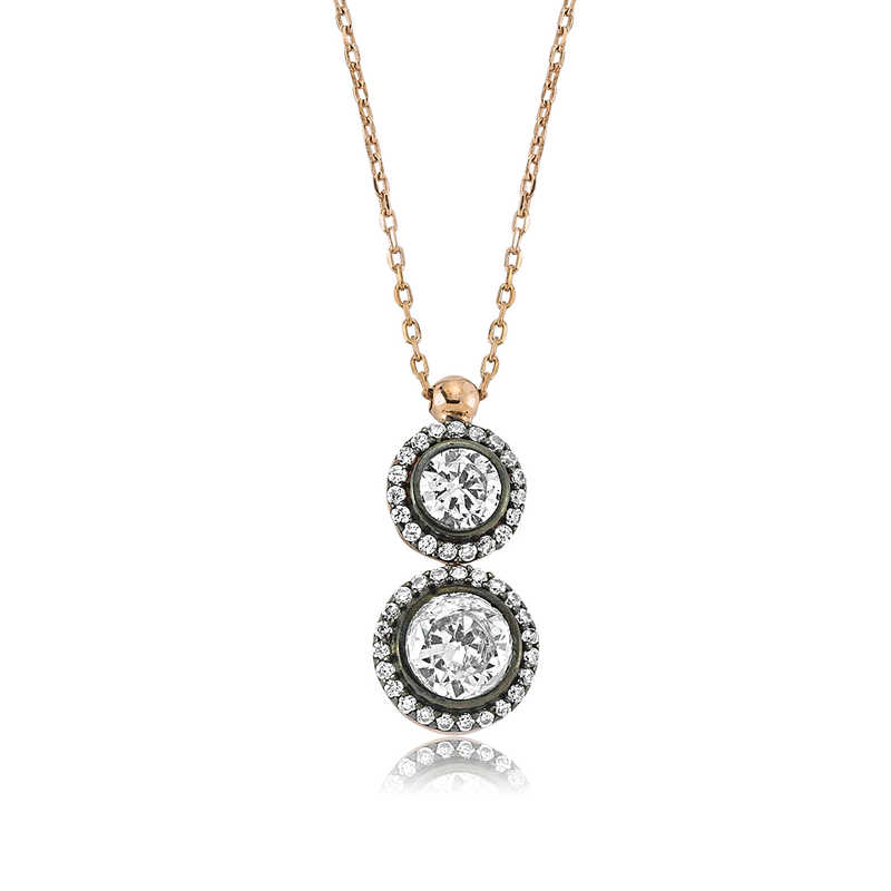 İki tane taşın birleşimiyle oluşan bu gümüş elmas model bayan kolye ile tarzınızı ortaya koyun. Sade ve şık tasarımıyla özel günlerinizde tercih edebileceğiniz bir modeldir. Elmas model bayan kolye 925 ayar gümüşten imal edilmiştir. Gümüş üzerine rose altın kaplama yapılmıştır. Rose altın kaplama yapılan gümüş bayan kolye modelleri parlaklığını uzun süre muhafaza eder ve oksitlenmesi gecikir. Kolye üzerinde bulunan taşlar zirkondur. Gümüş zincirin boyu ortalama 45 cm'dir. Tüm gümüş bayan kolye modellerinde olduğu gibi elmas model bayan kolye modeli de el emeği ile üretilmiştir. Gümüş ve değerli taşlar nedeniyle belirtilen ortalama ürün ağırlığında ± %10 sapma olabilmektedir.