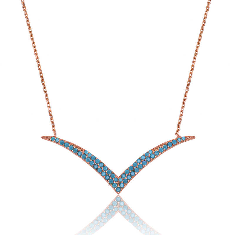 Modern tarzda üretilen martı desenli firuze taşlı gümüş kolye özel tasarım koleksiyondur. Günümüzün trendlerine uygun modeliyle herkesin severek takıp sürekli kullanacağı veya sevdiklerine hediye edebileceği şık bir gümüş kolyedir. 925 ayar gümüşten imal edilmiştir. Gümüş üzerine rose kaplama yapılmıştır. Rose kaplama yapılan gümüş bayan kolye modelleri parlaklığını uzun süre muhafaza eder, gümüş rengini pembe renge dönüştürür ve oksitlenmeyi geciktirir. Üzerinde bulunan taşlar firuze renkli zirkondur. Zincir boyu ortalama 45 cm'dir. Gümüş kolye modellerinin tamamında olduğu gibi gümüş firuze taşlı martı bayan kolye de el emeği ile üretilmiştir. Gümüş ve değerli taşlar nedeniyle belirtilen ortalama ürün ağırlığında ± %10 sapma olabilmektedir.