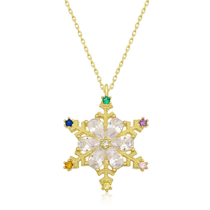 Her kar tanesinden aslında sadece bir tane var. Sevdiğiniz kişiye hediye ettiğiniz kar tanesi kolye ile onun sizin için eşsiz ve biricik olduğunu sessizce dillendirmiş oluyorsunuz. Sizlerde her zevke uygun gümüş kar tanesi kadın kolye modeli ile şıklığınıza ışıltı katın. Kar tanesi kadın kolye 925 ayar gümüşten imal edilmiştir. Gümüş üzerine gold kaplama yapılmıştır. Gold kaplama yapılan gümüş kadın kolye modelleri parlaklığını uzun süre muhafaza eder ve oksitlenmesi gecikir. Kolye üzerinde bulunan beyaz ve renkli taşlar zirkondur. Gümüş olan zincir boyu ortalama 45 cm'dir. Gümüş kar tanesi kadın kolye modeli diğer kar tanesi kadın kolye modelleri gibi el emeği ile üretilmiştir. Gümüş ve değerli taşlar belirtilen nedeniyle ürün ağırlığında ± %10 sapma olabilmektedir.