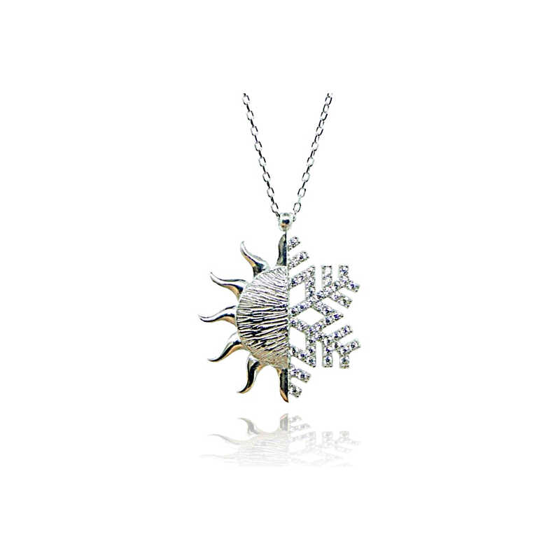 Güneş; ışığın, bilginin, iyiliğin, gücün ve yönetimin sembolüdür. Bu ışıl ışıl ve farklı tasarımıyla göz kamaştıran kolye; 925 ayar gümüşten imal edilmiştir. Gümüş üzerine rodyum kaplama yapılmıştır. Rodyum kaplama yapılan gümüş ürünler parlaklığını uzun süre muhafaza eder, oksitlenmesi gecikir. Gümüş güneş kartanesi bayan kolye üzerinde bulunan taşlar zirkon'dur. Tüm gümüş kolyelerde olduğu gibi gümüş güneş bayan kolye de tamamı el emeği ile üretilmiştir. Gümüş ve değerli taşlar nedeniyle belirtilen ortalama ürün ağırlığında ± %10 sapma olabilmektedir.