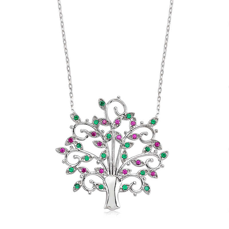 Ağaç kolye; yeni bir yaşamı, hayatın enerjisini ve yepyeni fırsatları temsil eder. Kökleri yerdeyken, göklere yükselen dalları ile cennetle yeryüzünü birleştiren bir köprü olmuştur. Yeni bir yaşamın büyümesini, soyunu devam ettirmesini ve ailenin simgesi olarak yorumlanıyor. Ve tam da bu nedenle genellikle aile olarak görülen ya da “ailem olmanı istiyorum” dileğiyle çok sevilen insanlara hediye ediliyor. Siz de sevdiklerinize ve aileniz olmasını istediğiniz değer verdiğiniz kişilere bu kolyeyi hediye edebilir, onlara vermiş olduğunuz değeri gösterebilirsiniz. Gümüş hayat ağacı kolye modeli 925 ayar gümüşten imal edilmiştir. Gümüş üzerine rodyum kaplama yapılmıştır. Rodyum kaplama yapılan gümüş kolye modelleri parlaklığını uzun süre muhafaza eder ve oksitlenmesi gecikir. Kolye üzerinde bulunan yeşil ve kırmızı taşlar zirkondur. Gümüş olan zincir boyu ortalama 45 cm'dir. Tüm gümüş kolye modellerinde olduğu gibi gümüş hayat ağacı kolye modeli de el emeği ile üretilmiştir. Gümüş ve değerli taşlar nedeniyle belirtilen ortalama ürün ağırlığında ± %10 sapma olabilmektedir.