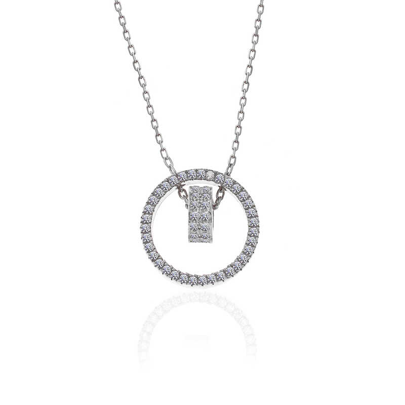 İçe içe geçmiş halka kadın kolye, sembollerden hoşlanmayıp sadelikten yana olanların tercih edebileceği oldukça şık bir tasarımdır. Gümüş iç içe geçmiş halka kadın kolye, son yıllarda oldukça popüler modeller arasındaki yerini almıştır. Gümüş iç içe geçmiş kadın kolye 925 ayar gümüşten imal edilmiştir. Bu kolye üzerine rodyum kaplama yapılmıştır. Rodyum kaplama yapılan ürünler parlaklığını uzun süre muhafaza eder. Üzerinde bulunan taşlar zirkon'dur. Tüm gümüş kadın kolye modellerinde olduğu gibi gümüş iç içe geçmiş halka kadın kolye modeli de el emeği ile üretilmiştir. Gümüş ve değerli taşlar nedeniyle belirtilen ortalama ürün ağırlığında ± %10 sapma olabilmektedir.